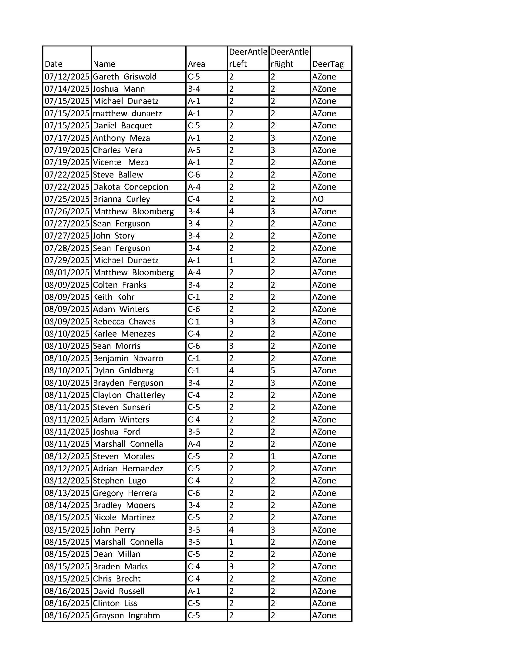 2019 DEER SEASON A ZONE ARCHERY: 13 July - 4 August 2019 Harvest: 6 A ZONE GENERAL: 10 August - 22 September 2019 Harvest: 112 2019 July Daily Harvest click here 2019 August Daily Harvest click here 2019 September Daily Harvest click here 2019 Deer Harvest Breakdown click here Deer Harvest History click here