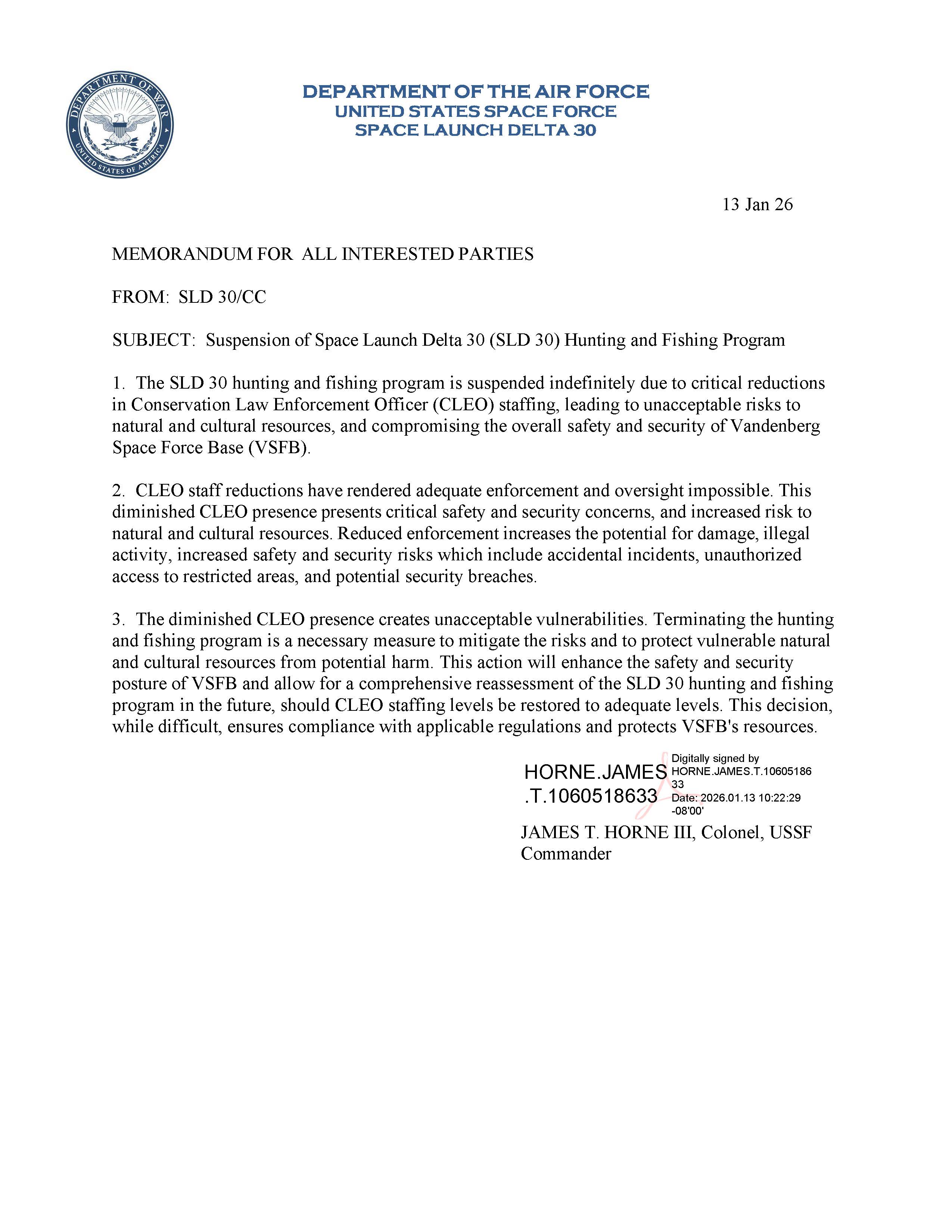 The Installation Commander closed hunting/fishing indefinitely until we have sufficient amount of trained officers on the road to reopen